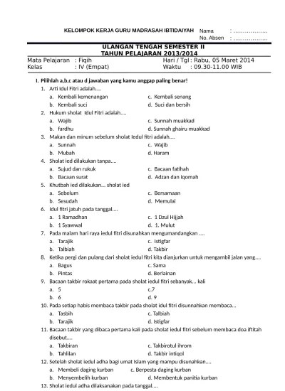 Siswa menghadapi un pada siswa kelas vi mi miftahul huda tamansari. 14syeikh abdurrahman al jaziri, kitab shalat fiqih empat madzhab,bandung, mizan,. Shalat idul fitri dan idul adha; Ki dan kd mapel fikih mi kelas 4 sesuai kma no 183 tahun 2019. Sholat berikut yang dikerjakan setelah sholat isya' adalah … a.
